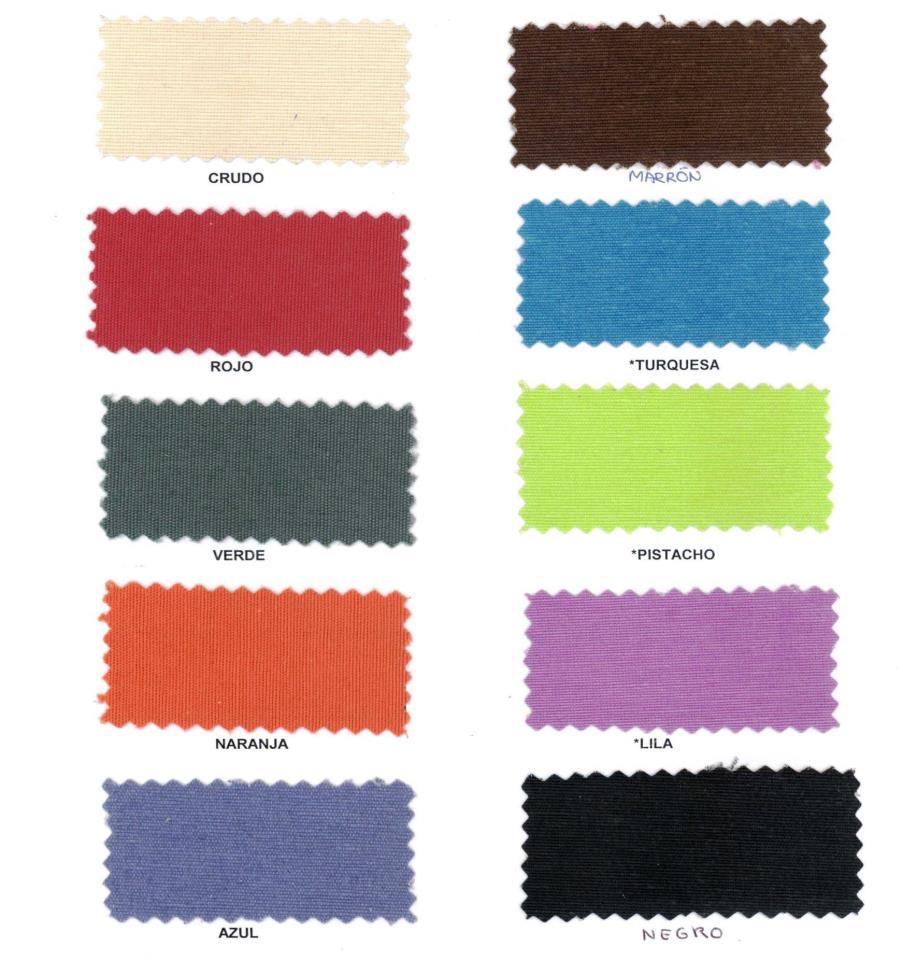 ARENA, AZUL, BLANCO, CRUDO, GRIS, LILA, MARRON, NARANJA, NEGRO, PISTACHO, ROJO, TURQUESA, VERDE