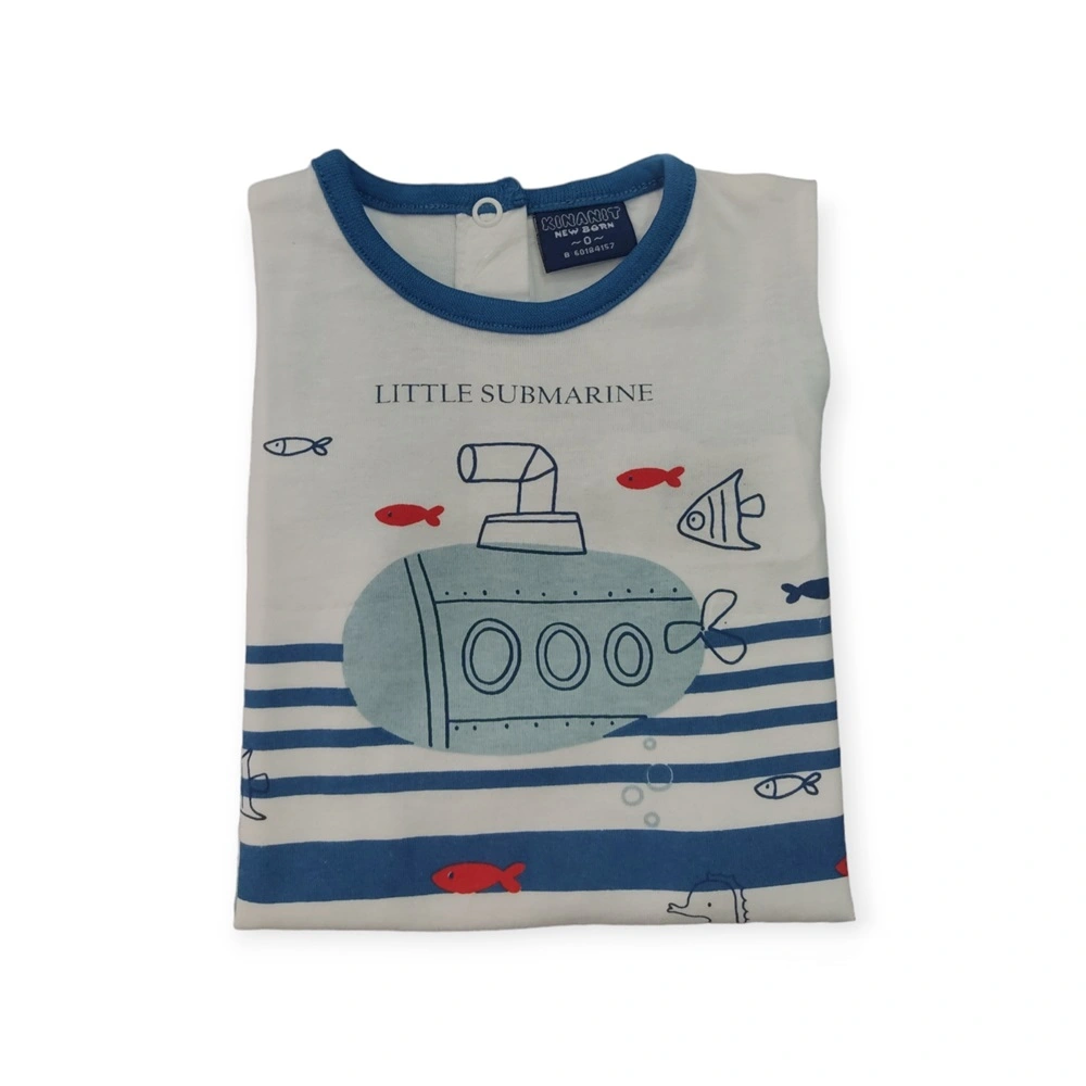 Pelele de verano de manga corta para bebé en 100% Algodón, lo que lo hace suave, transpirable y cómodo. Tiene un diseño sencillo y clásico, con rayas horizontales azules y  blancas.