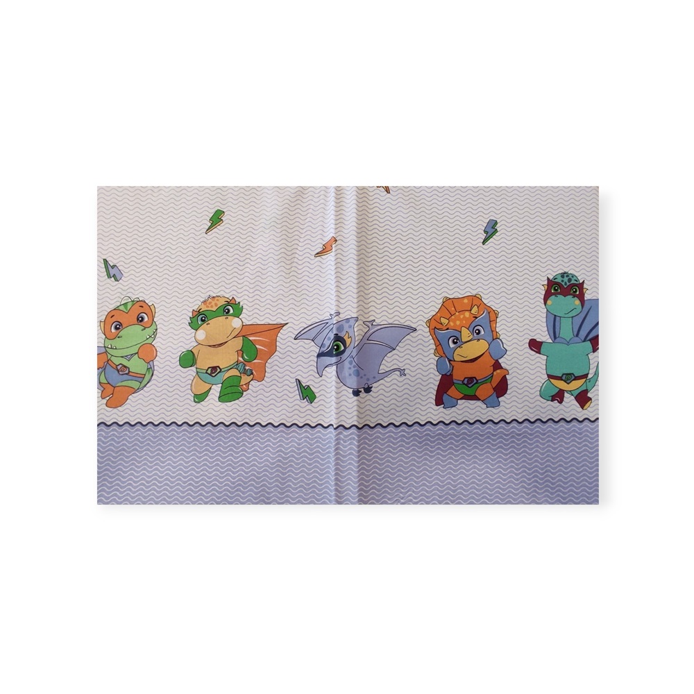 Divertidas sábanas con estampados de dinosaurios caracterizados de superhéroes, en multicolor. Combina con cualquier habitación infantil. La sábana bajera es en fondo color azul con unas ondas en color blanco por toda la superficie.