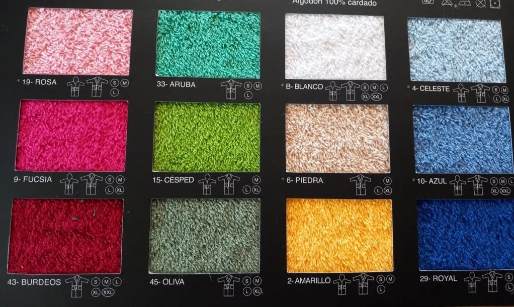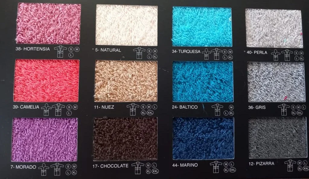 AMARILLO, AQUA, ARUBA, AZUL, BALTICO, BLANCO, BURDEOS, CAMELIA, CELESTE, CESPED, CHOCOLATE, FUCSIA, GRIS, HORTENSIA, MANZANA, MARINO, MORADO, NATURAL, NUEZ, OCRE, OLIVA, PERLA, PIEDRA, PIZARRA, ROSA, ROYAL, TURQUESA