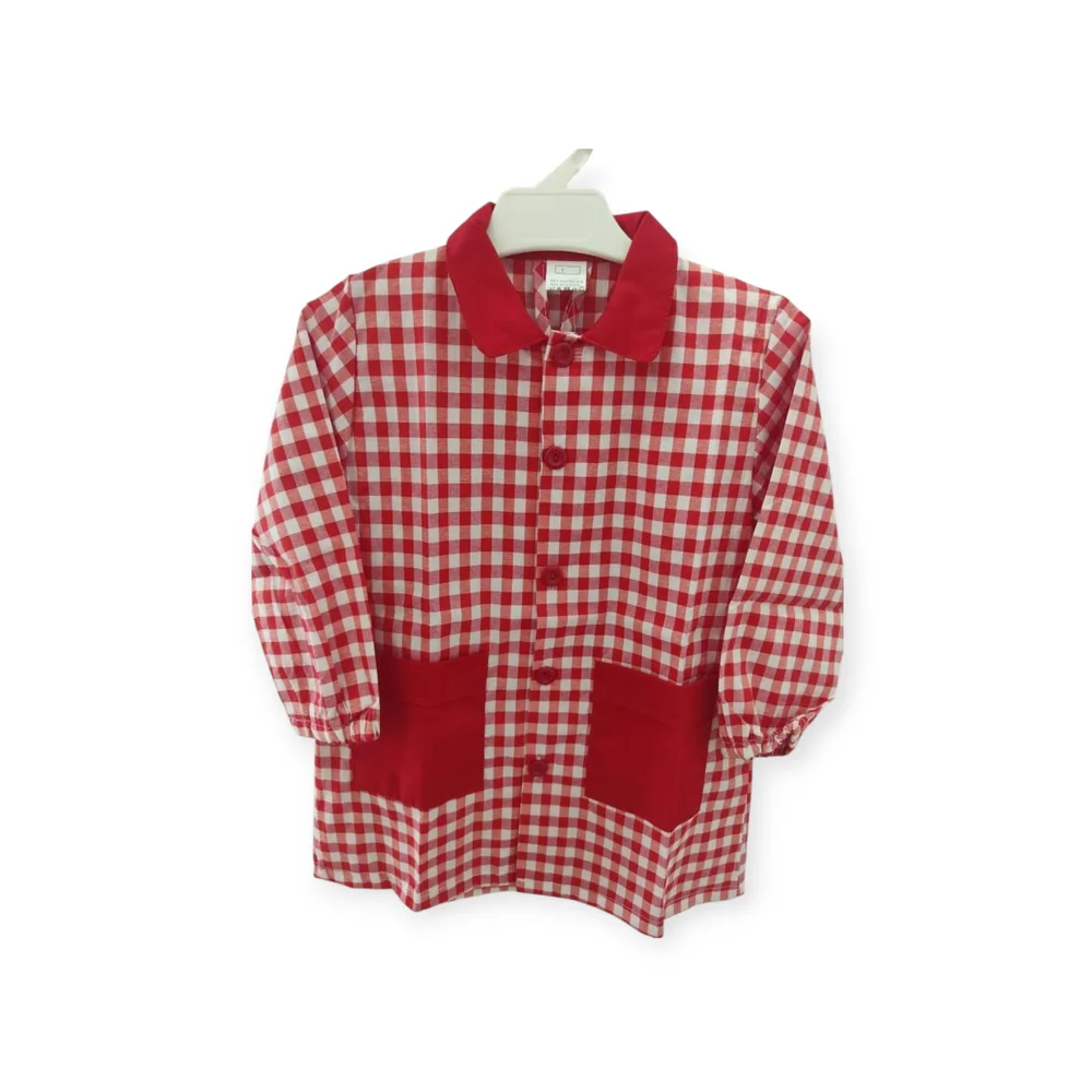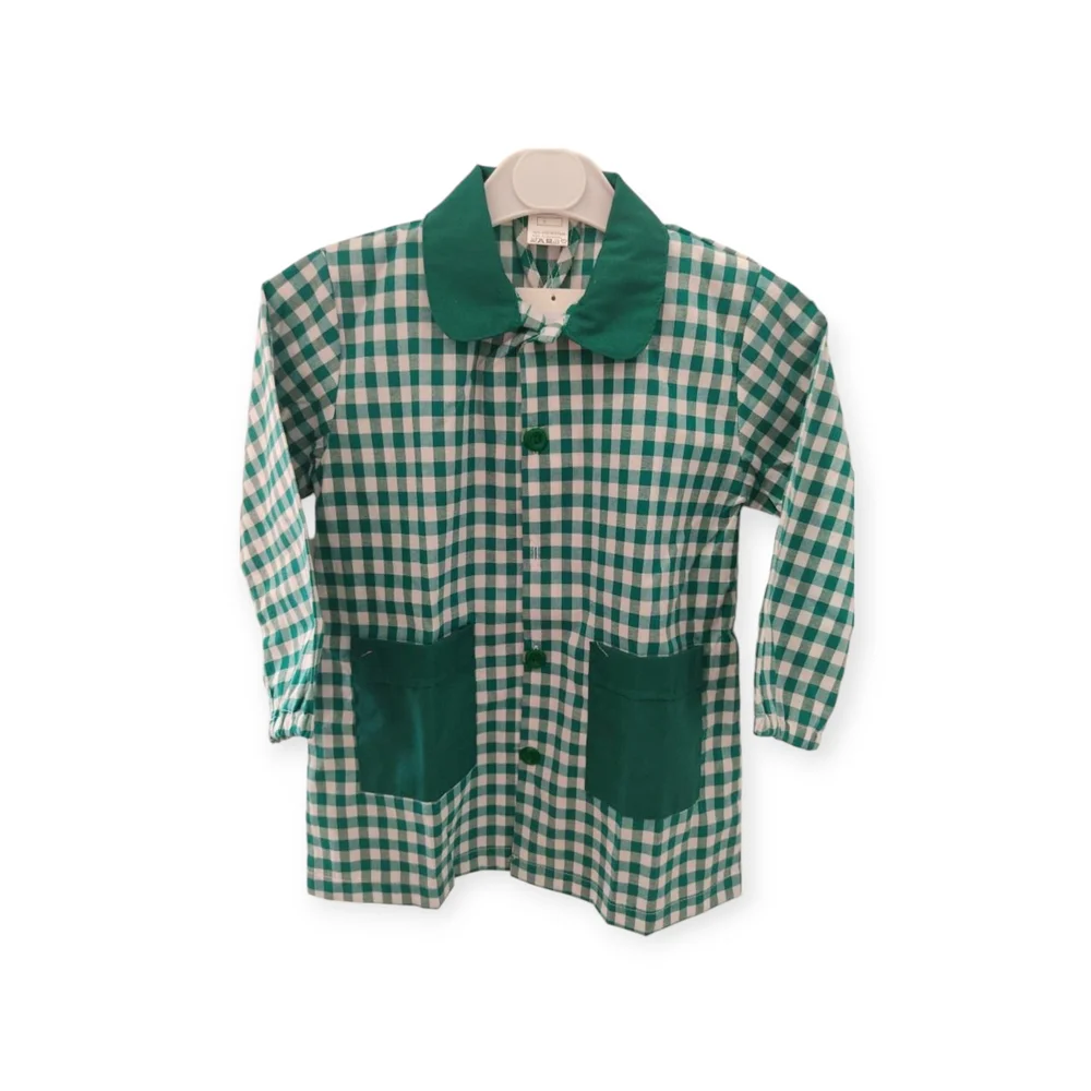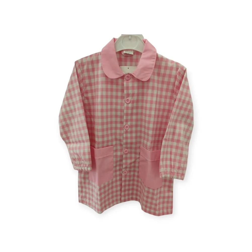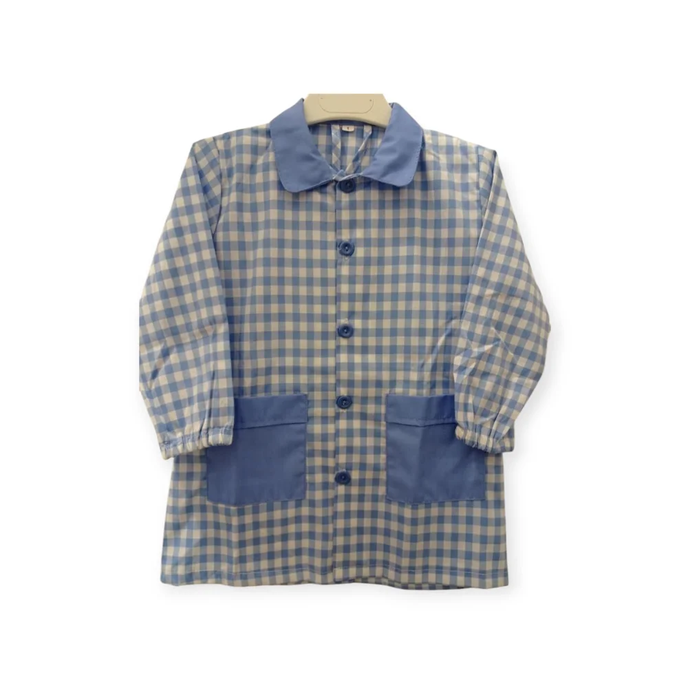 Babi de colegio abierto con botones. Cuadro grande y cuello y dos bolsillos a juego en color liso. Con goma en los puños.
