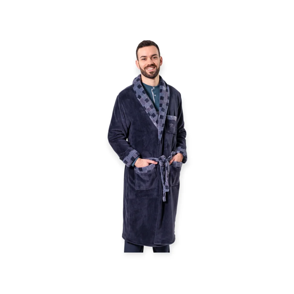 Bata de hombre corta cruzada. Lleva dos bolsillos en los laterales a la altura de la cintura. Su tejido es de Coralina. Tiene un tacto muy suave, agradable y muy cálido. Es un tejido muy ligero.