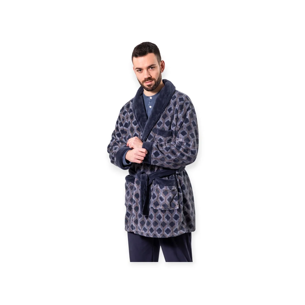 Bata de hombre corta cruzada. Lleva dos bolsillos en los laterales a la altura de la cintura. Su tejido es de Coralina. Tiene un tacto muy suave, agradable y muy cálido. Es un tejido muy ligero.