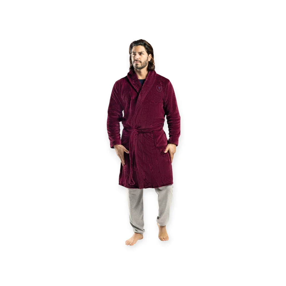 Bata de hombre de coralina en color burdeos liso con bordado de escudo en pecho izquierdo. El tejido lleva un pequeño relieve haciendo un efecto pana. Cruzada con lazo y con dos bolsillos delanteros a la altura de la cintura.