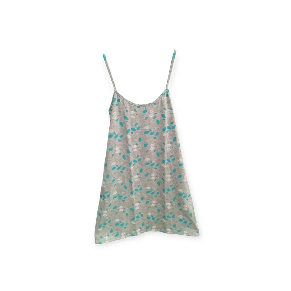 Camisón de verano de tirante fino con estampado de hojas. El fondo es en color gris y las hojas son en color blanco y turquesa, con toques de gris más oscuro.