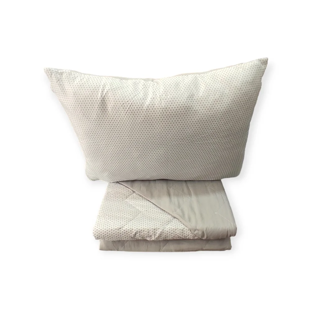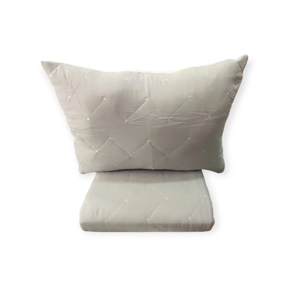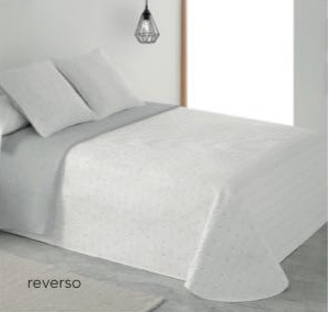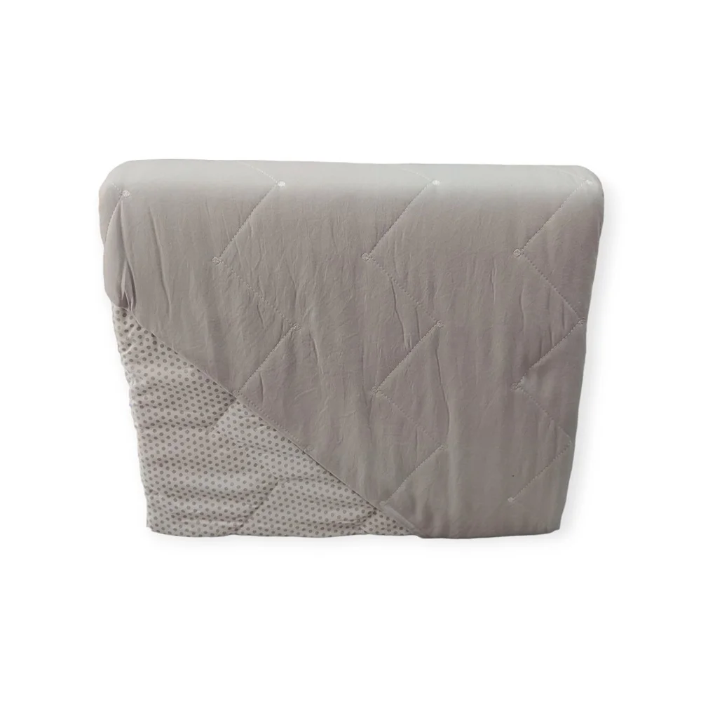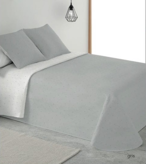Colcha lisa gris en una cara con el reverso de fondo blanco y estampado de lunares grises. Con ligero relleno, presenta un cosido horizontal en forma de zig zag en ambas caras. Su tejido es extra suave, muy agradable al tacto.