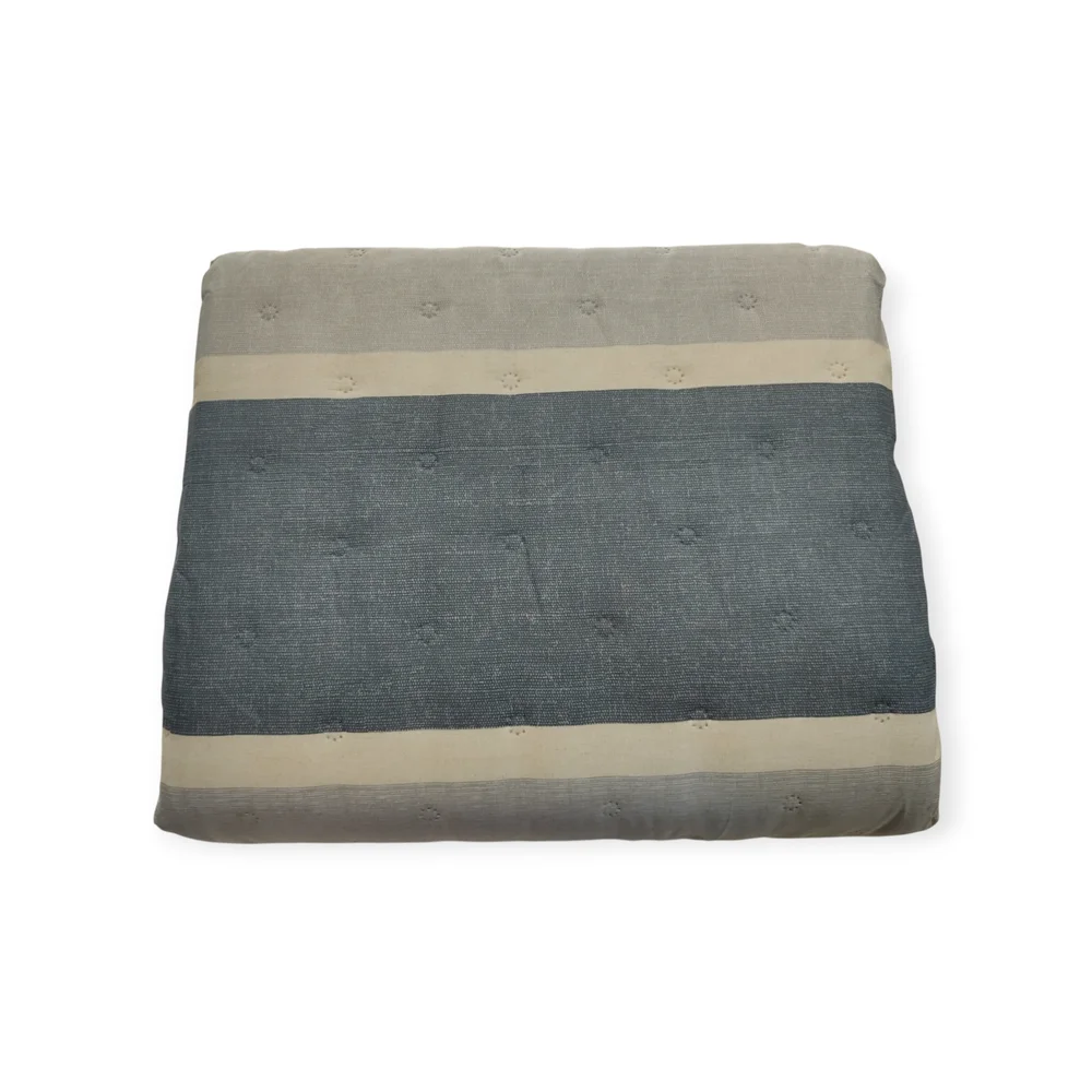 Colcha termo sellada reversible con dos estampados distintos. Una cara en franjas horizontales multicolor y el reverso en semiliso.