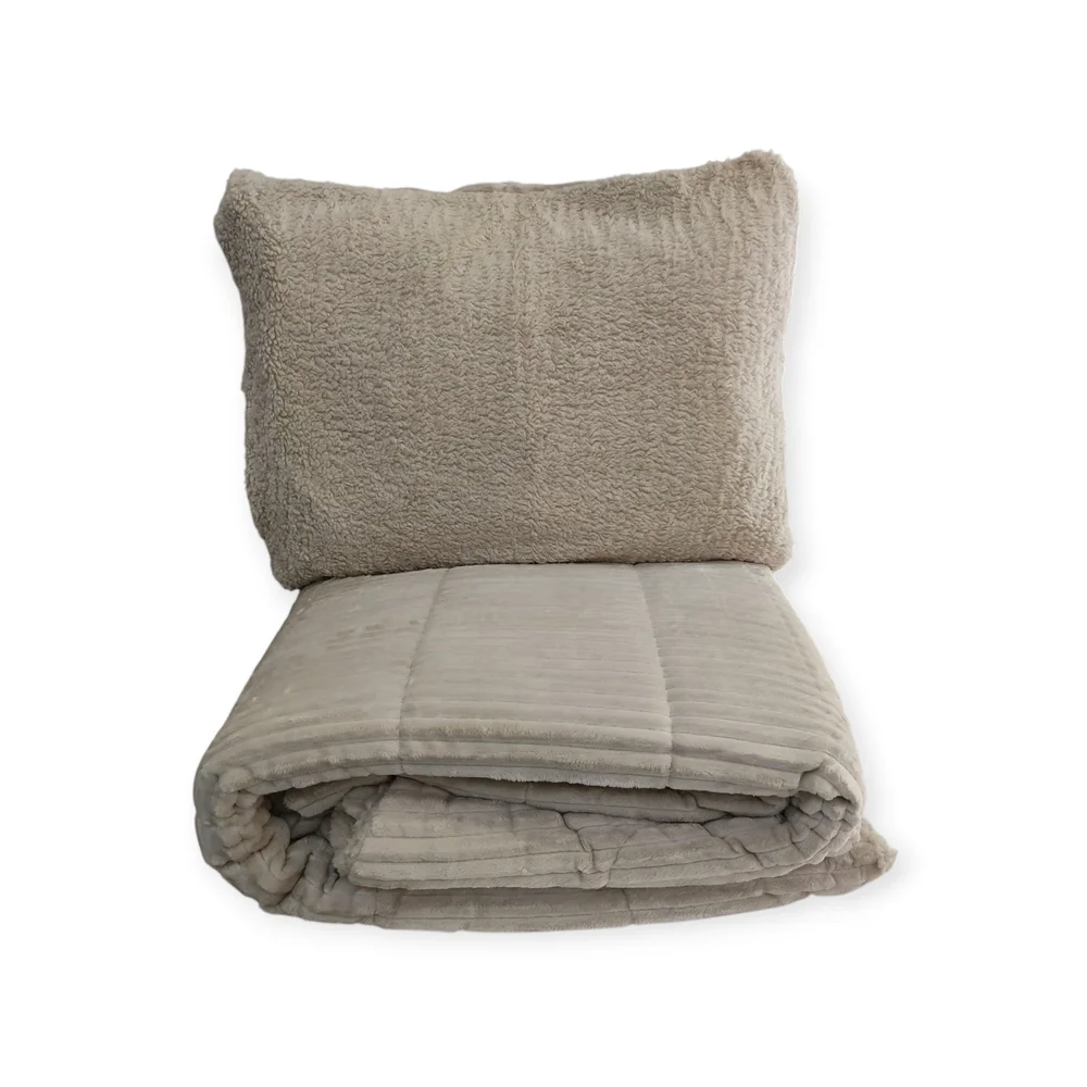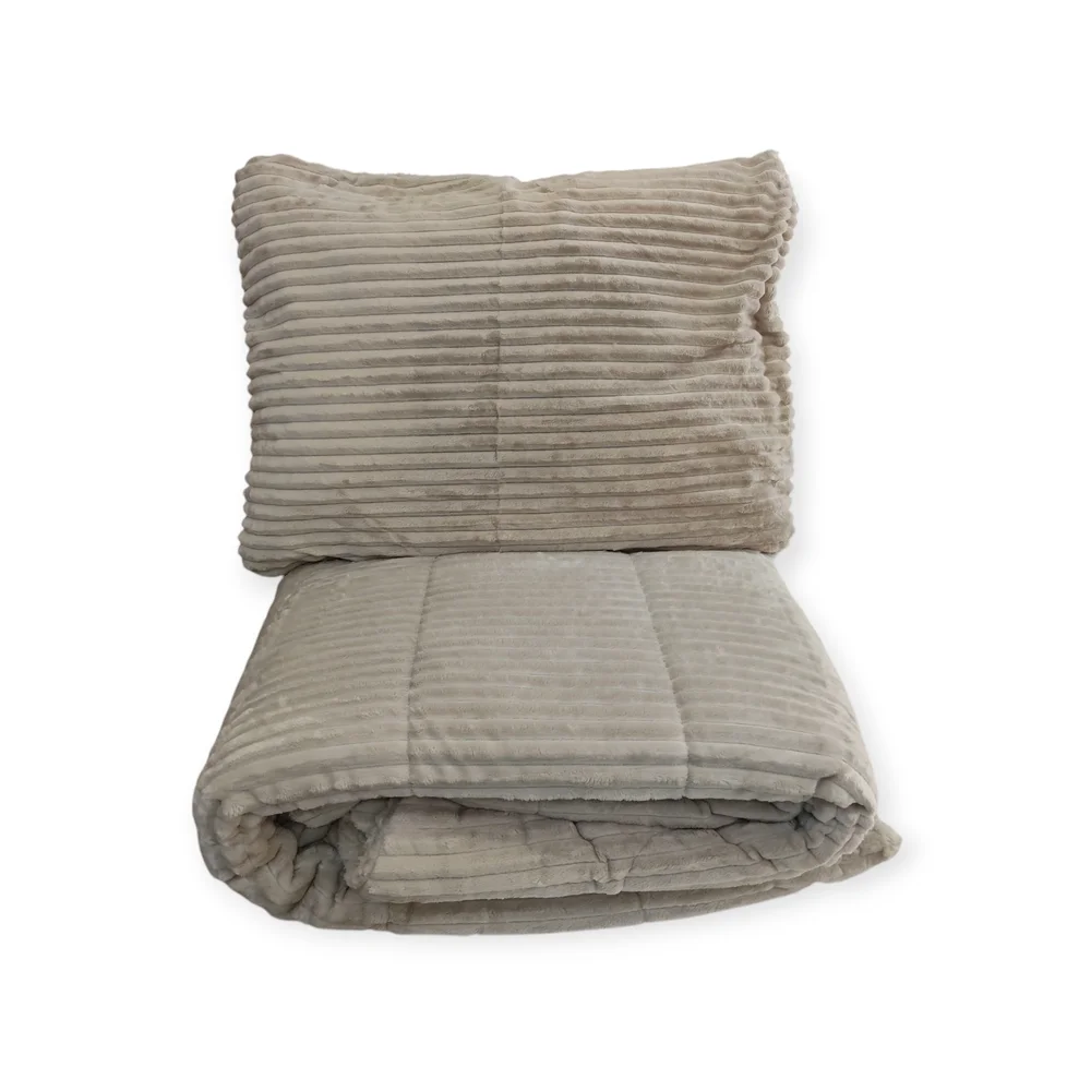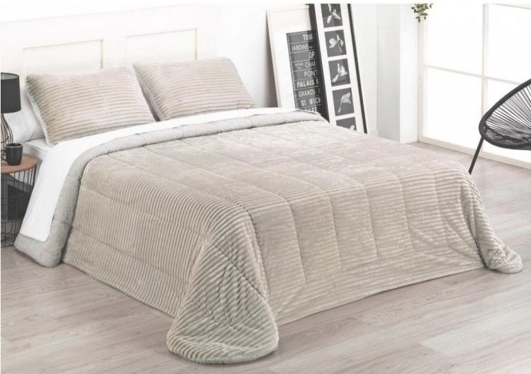 Comforter con un original efecto de pana en color beige. El tejido es nacarina, relleno de microfibra y su reverso es sherpa. El gramaje por metro cuadrado es de 570 gramos.  Tiene un tanto muy suave y es ligero, pero a su vez es un tejido muy cálido.