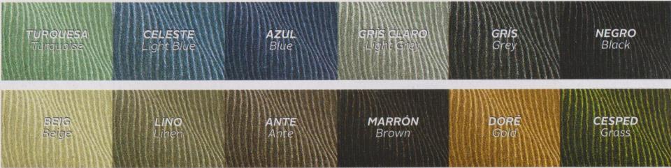 ANTE, AZUL, BEIG, BURDEOS, CALDERA, CELESTE, CESPED, DORE, FUCSIA OSCURO, GRIS, GRIS CLARO, LINO, MARRON, NEGRO, ROSA PASTEL, TURQUESA