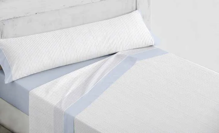 Juego de sábanas de 3 ó 4 piezas con encimera y funda(s) de almohada con estampado de rayas verticales. Tejido de 144 hilos de alta calidad. Muy suave y resistente a las lavadas. Con bajera apta para colchones de hasta 30 centímetros.