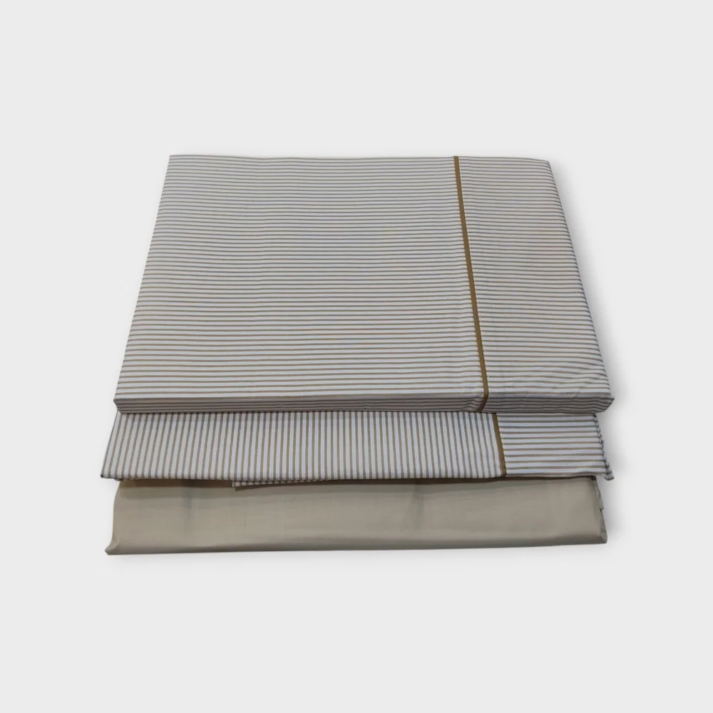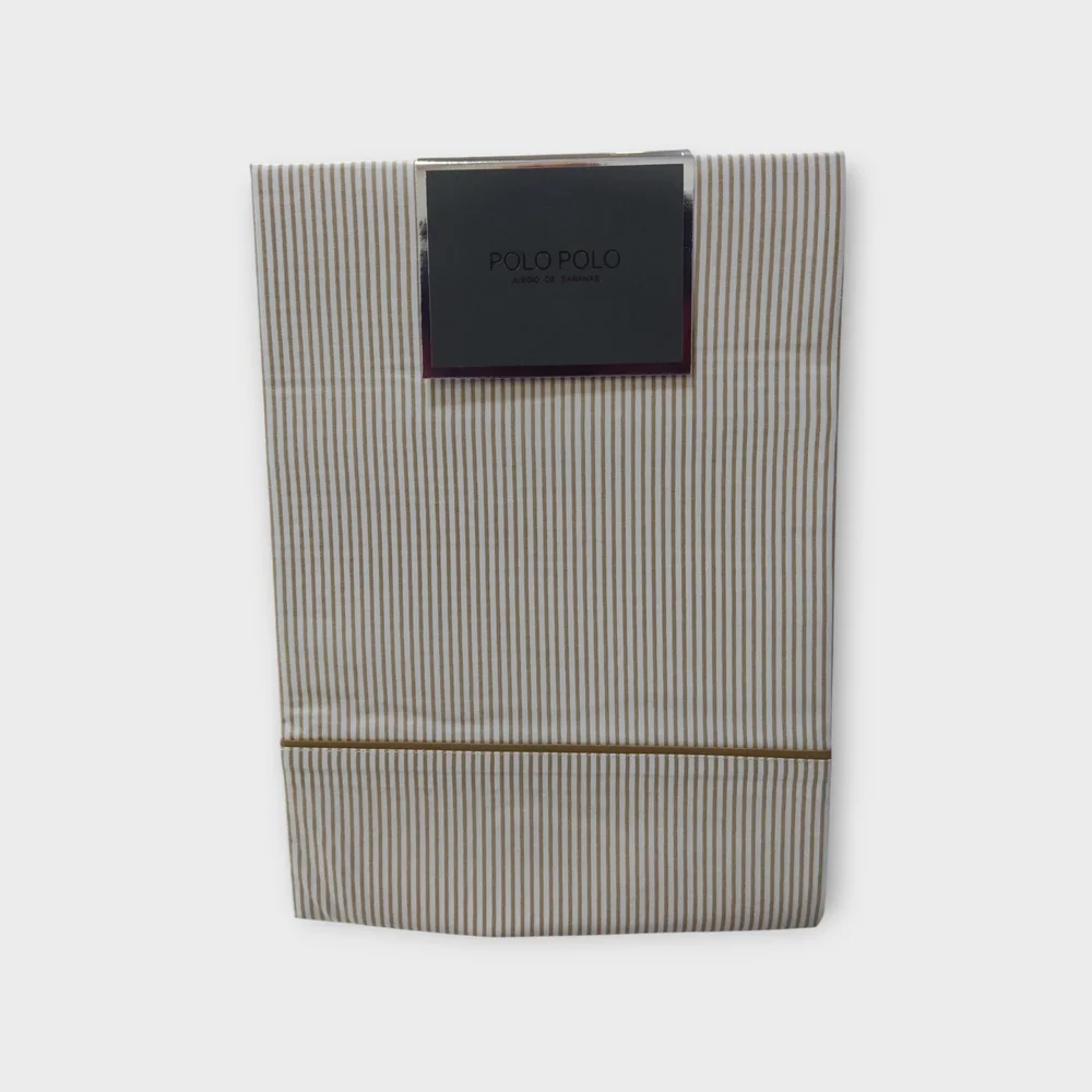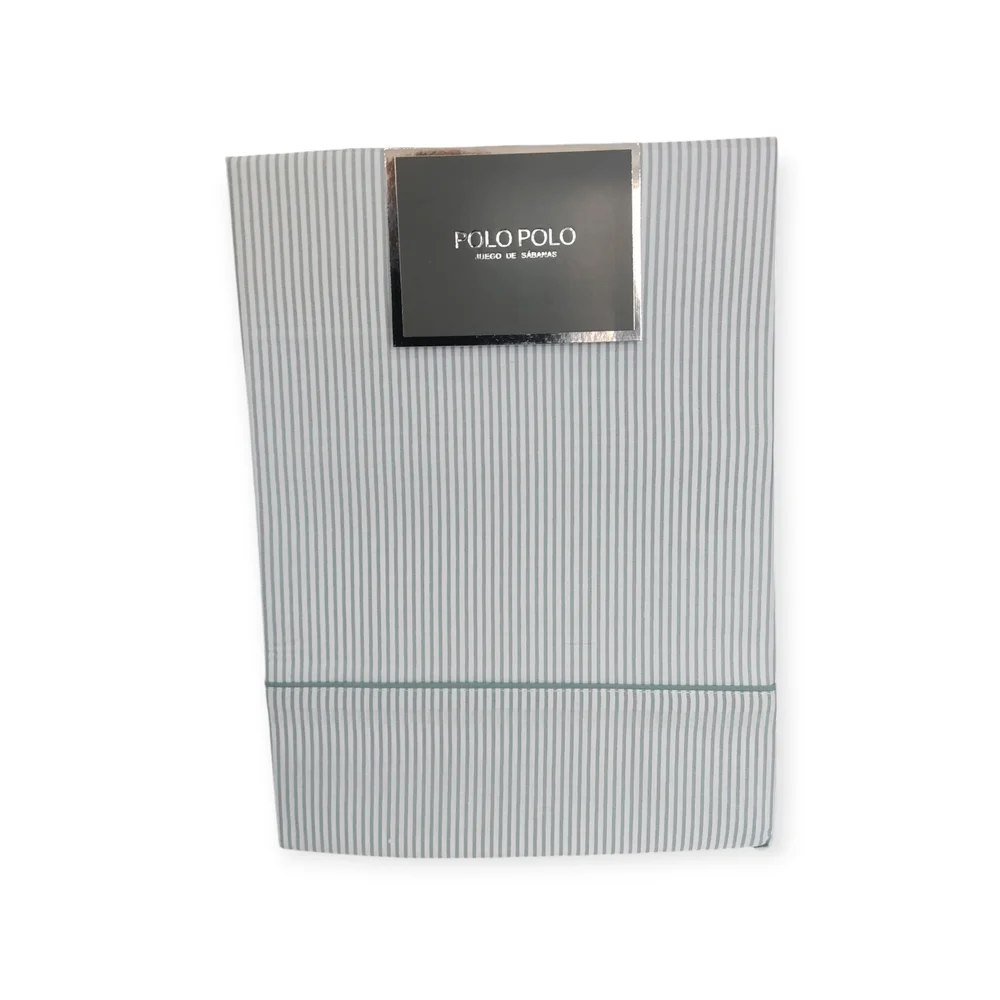 Juego de sábanas de 3 o 4 piezas. Tejido de 144 hilos, suave y muy resistente a las lavadas. Sábana bajera en color liso y goma en los extremos. Encimera y almohada de fondo blanco con raya diplomática.