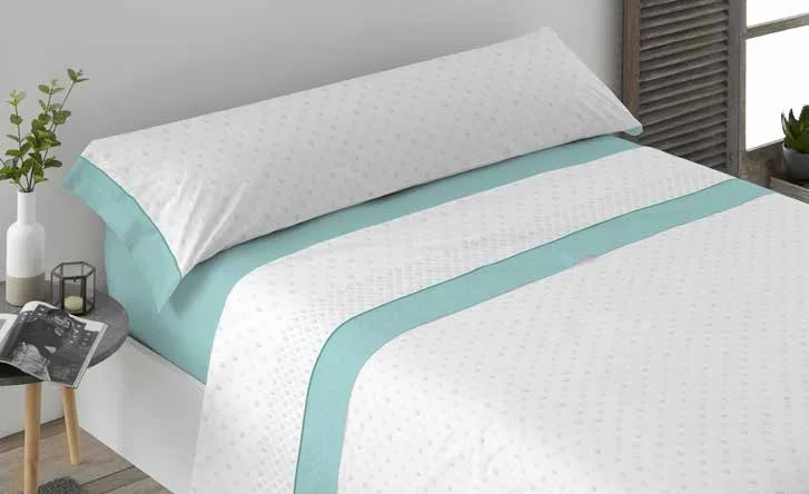 90: Sábana encimera 160×270 cm., Sábana bajera 90×200+30 cm. y funda de almohada 45×110 cm.