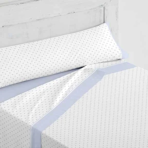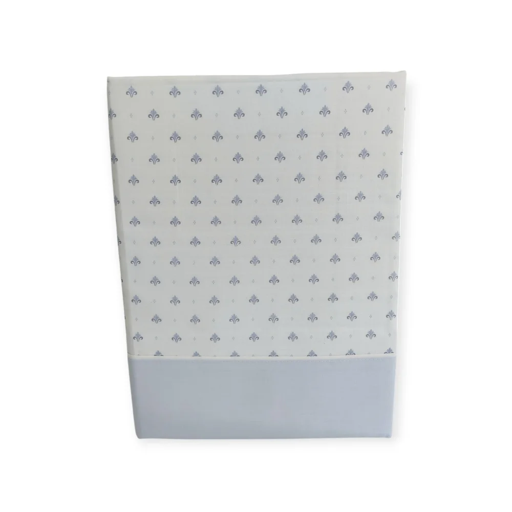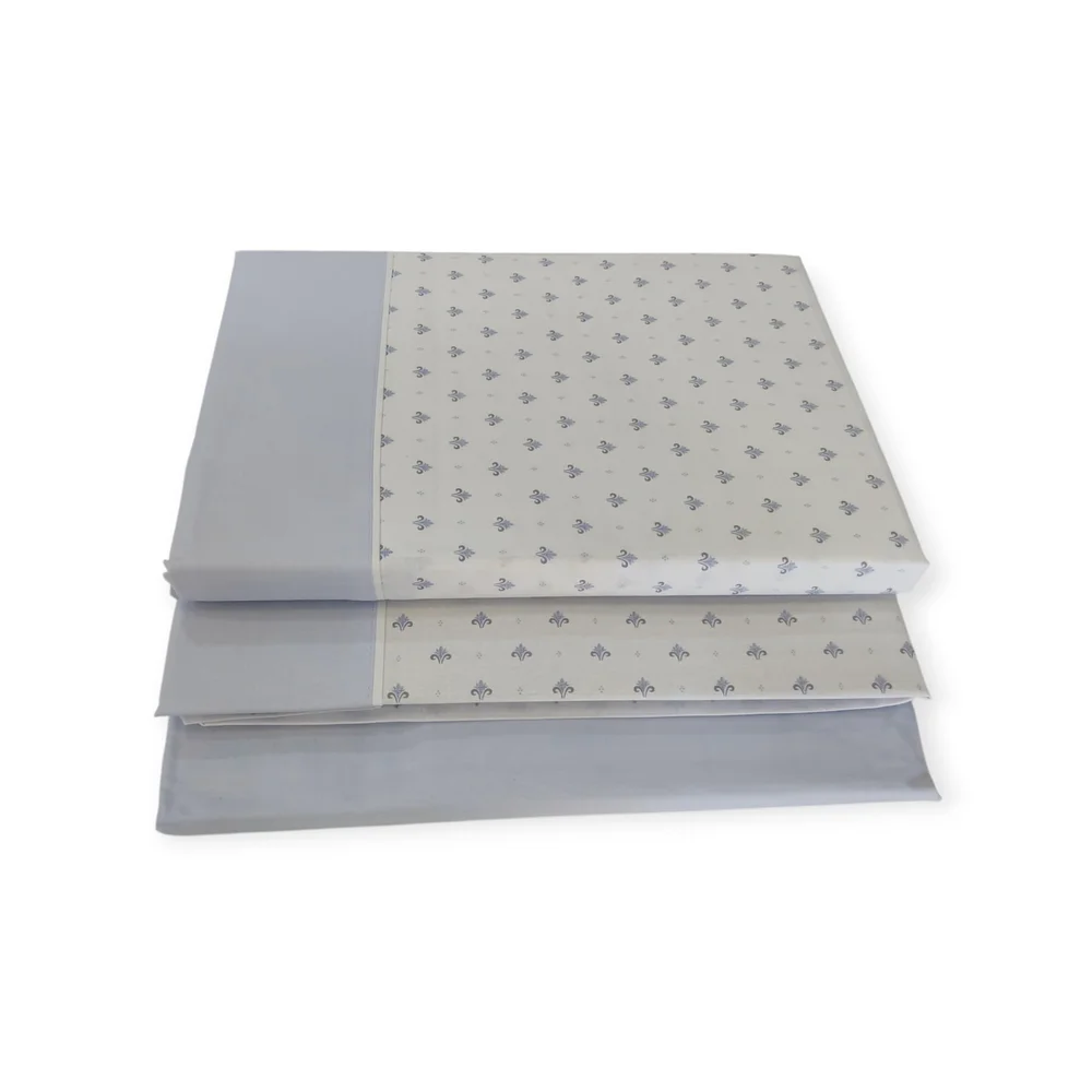 Juego de sábanas de 3 ó 4 piezas con encimera y funda(s) de almohada con estampado de flor de lys en color azul sobre fondo blanco. Sábana bajera en color azul liso. Tejido de 144 hilos de alta calidad. Muy suave y resistente a las lavadas. Con bajera apta para colchones de hasta 30 centímetros.