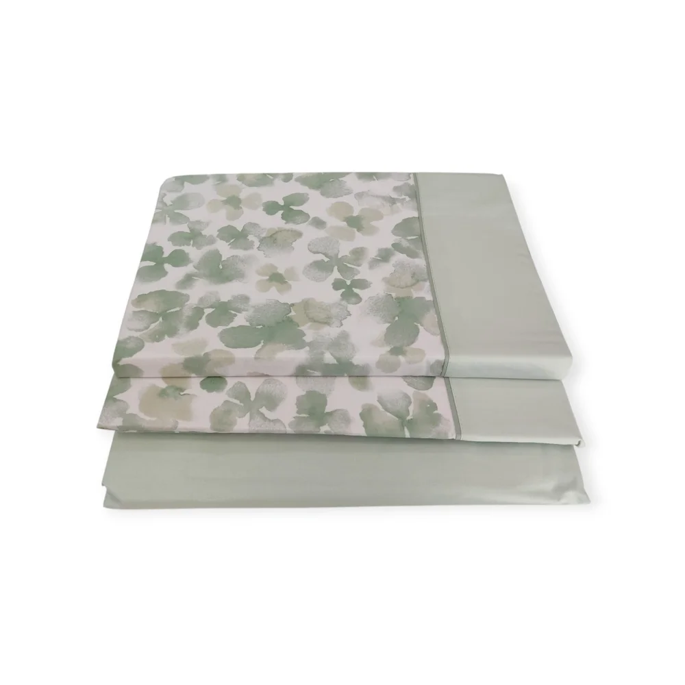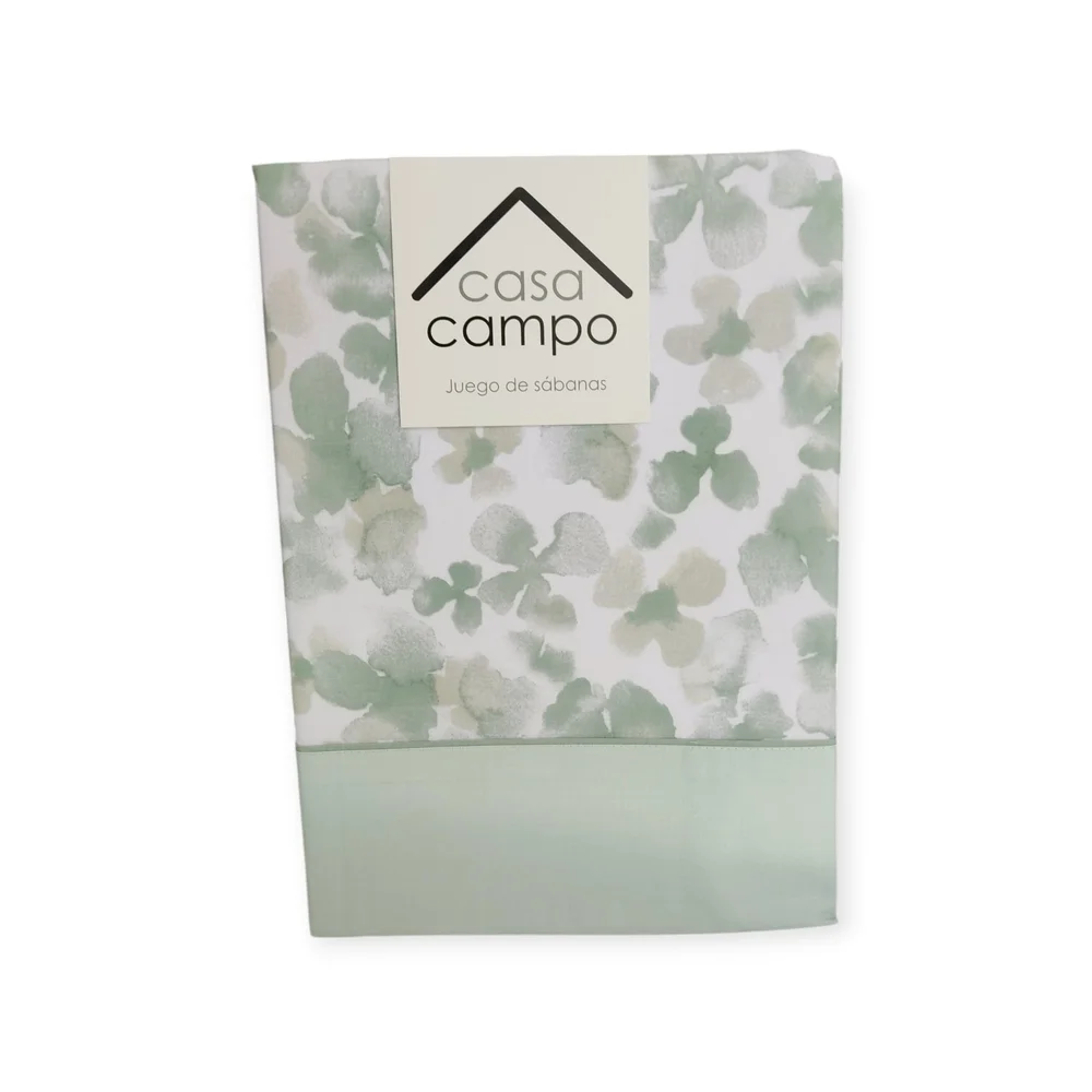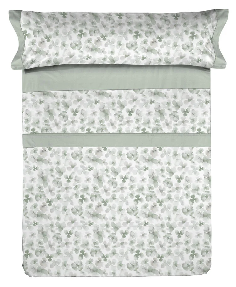 Juego de sábanas con estampado floral en color verde en la sábana encimera y en la funda de almohada. La sábana bajera es en color liso.
