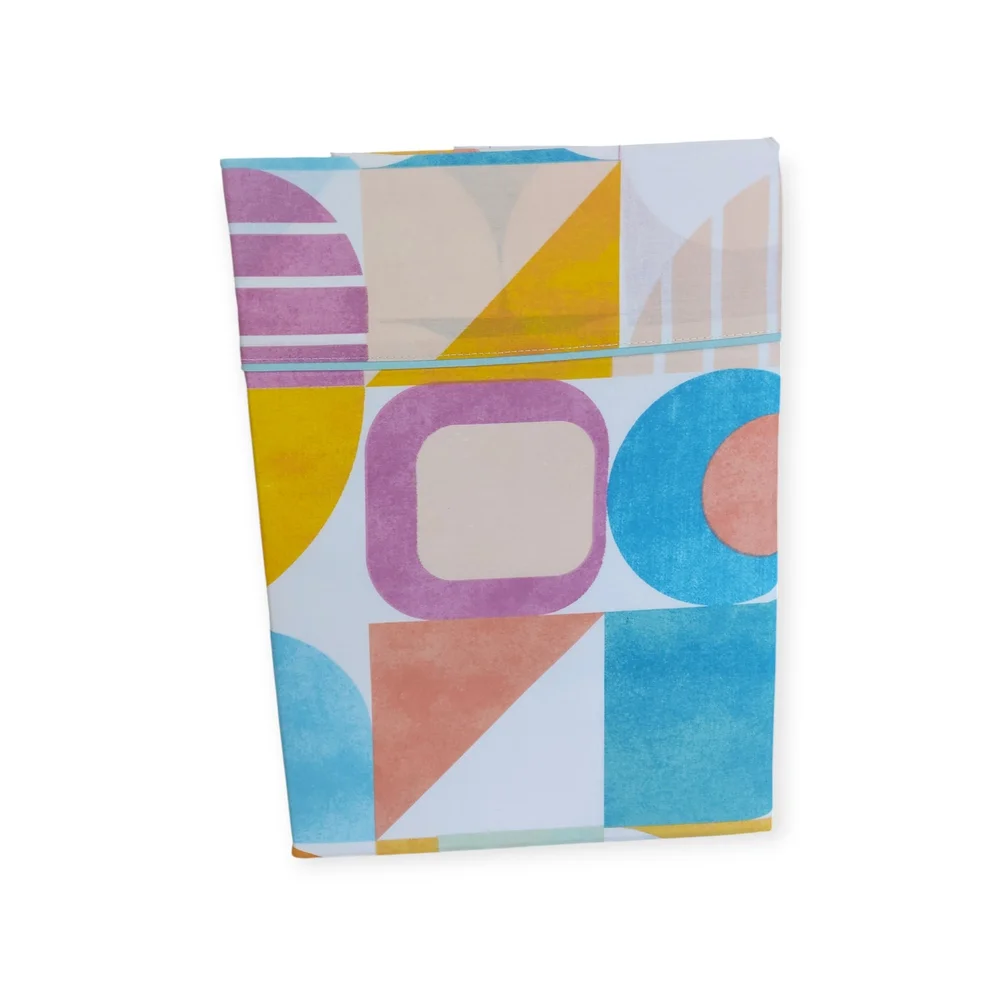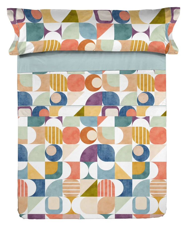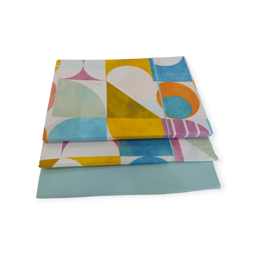 Sábana encimera y funda(s) de almohada con estampado de formas geométricas sobre fondo blanco y sábana bajera en color turquesa con la goma en los extremos.