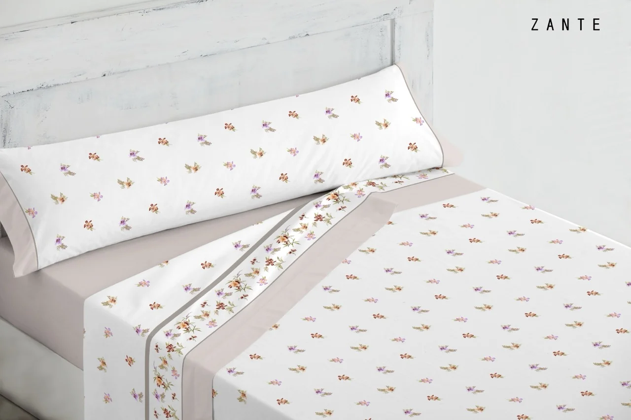 Juego de sábanas Zante visón. Encimera y funda de almohada con estampado de flores. Para dar un toque primaveral a cualquier habitación.
