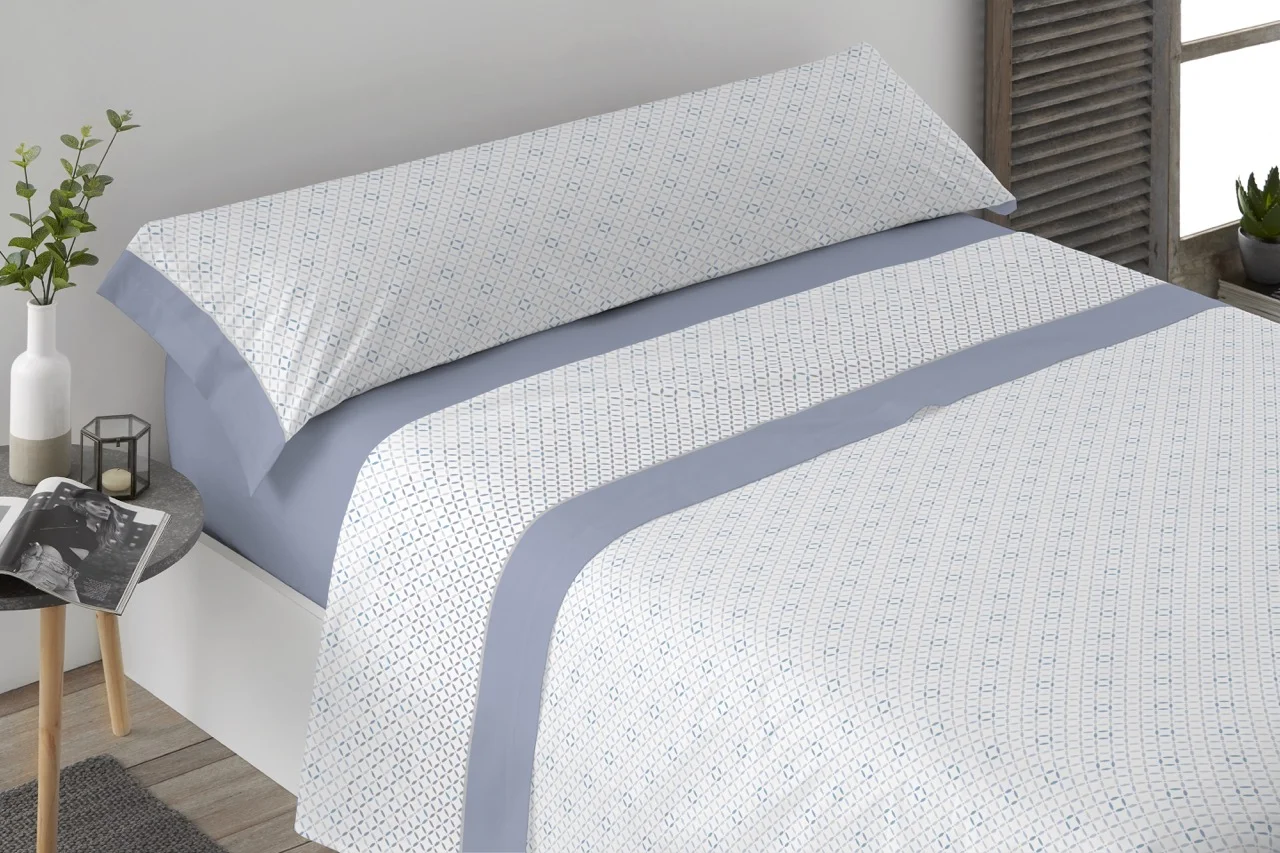160: Sábana encimera 240×270 cm., Sábana bajera 160×200+30 cm. y 2 fundas de almohada 45×85 cm.