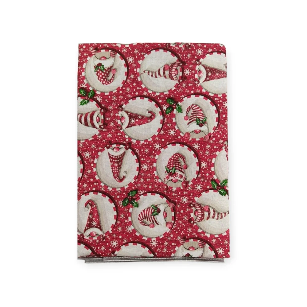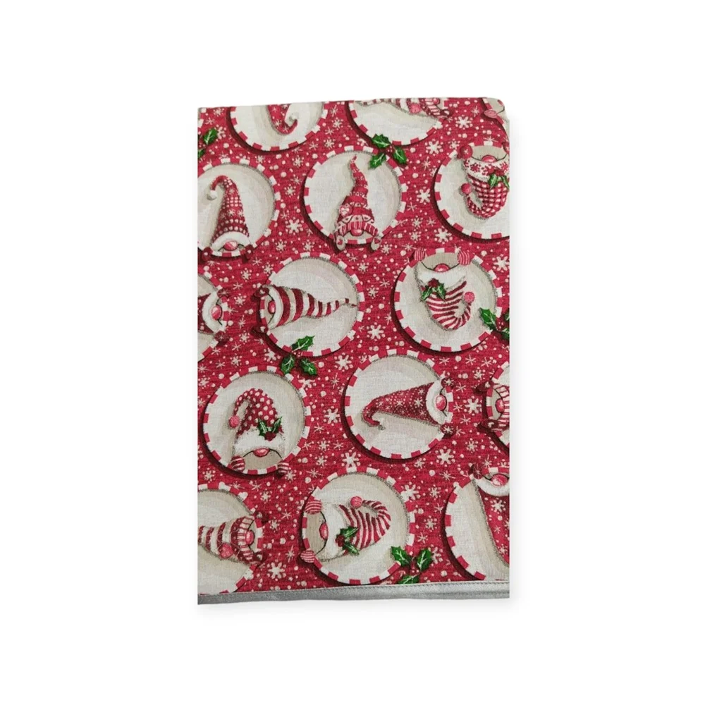Mantel de loneta para navidad. Con divertido dibujo de gnomos con fondo en color rojo.