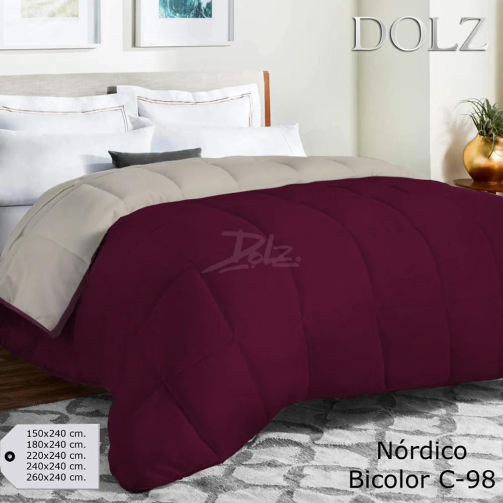 Relleno nórdico bicolor de diseño innovador. Permite 2 usos: como relleno para funda nórdica o Edredón reversible sin necesidad de funda. Relleno de 350 gramos/m2 de fibra hueca siliconada.