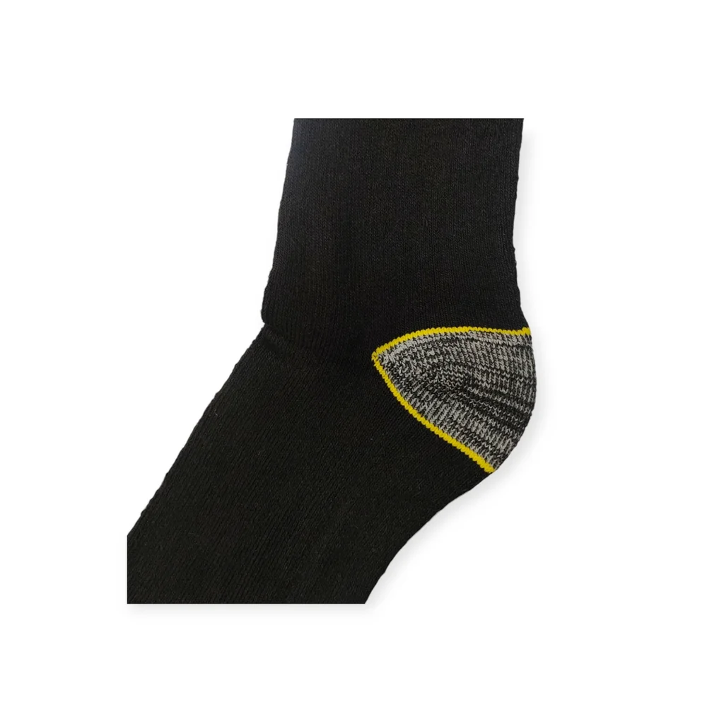 Pack de 3 calcetines en color negro especiales para trabajo. Ideales para su uso con botas. Calcetín grueso con puntera y talón reforzados. Incluye tres pares de calcetines en color negro.