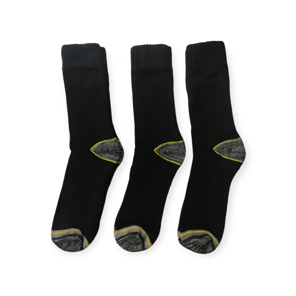 Pack de 3 calcetines en color negro especiales para trabajo. Ideales para su uso con botas. Calcetín grueso con puntera y talón reforzados.