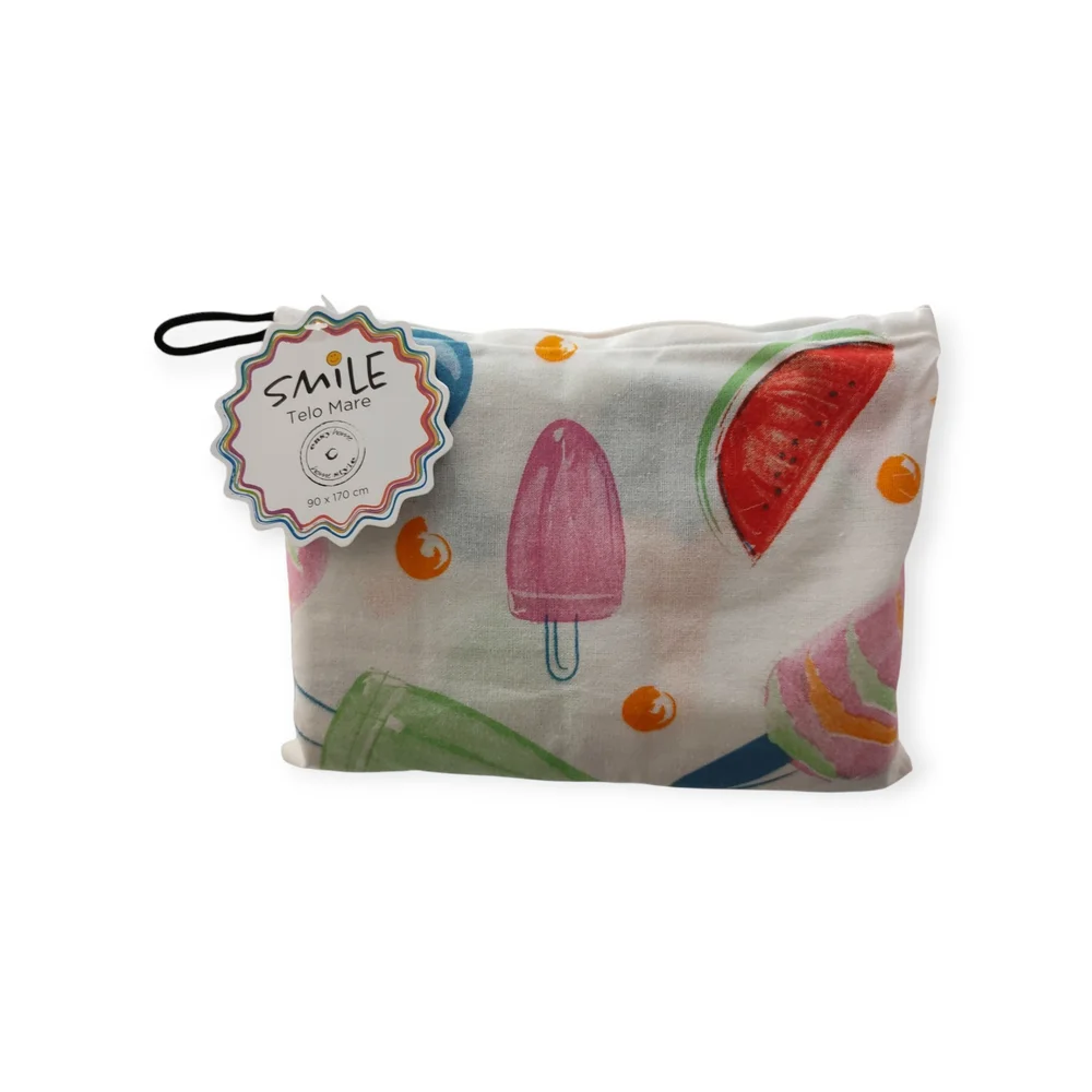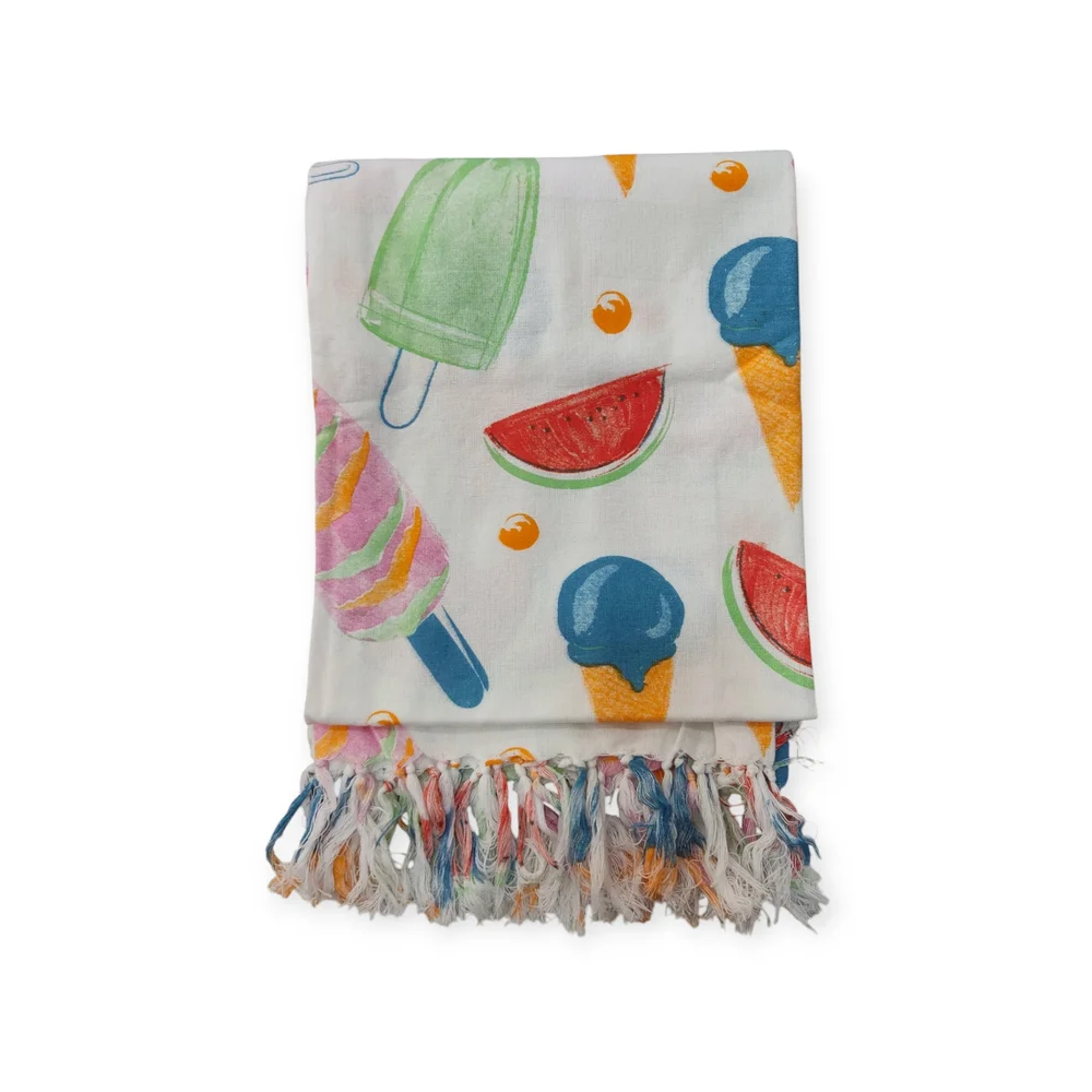 Pareo 100% algodón blanco con estampado de dibujos multicolor de piezas de frutas y helados. Acabado en todo el perímetro con flecos.