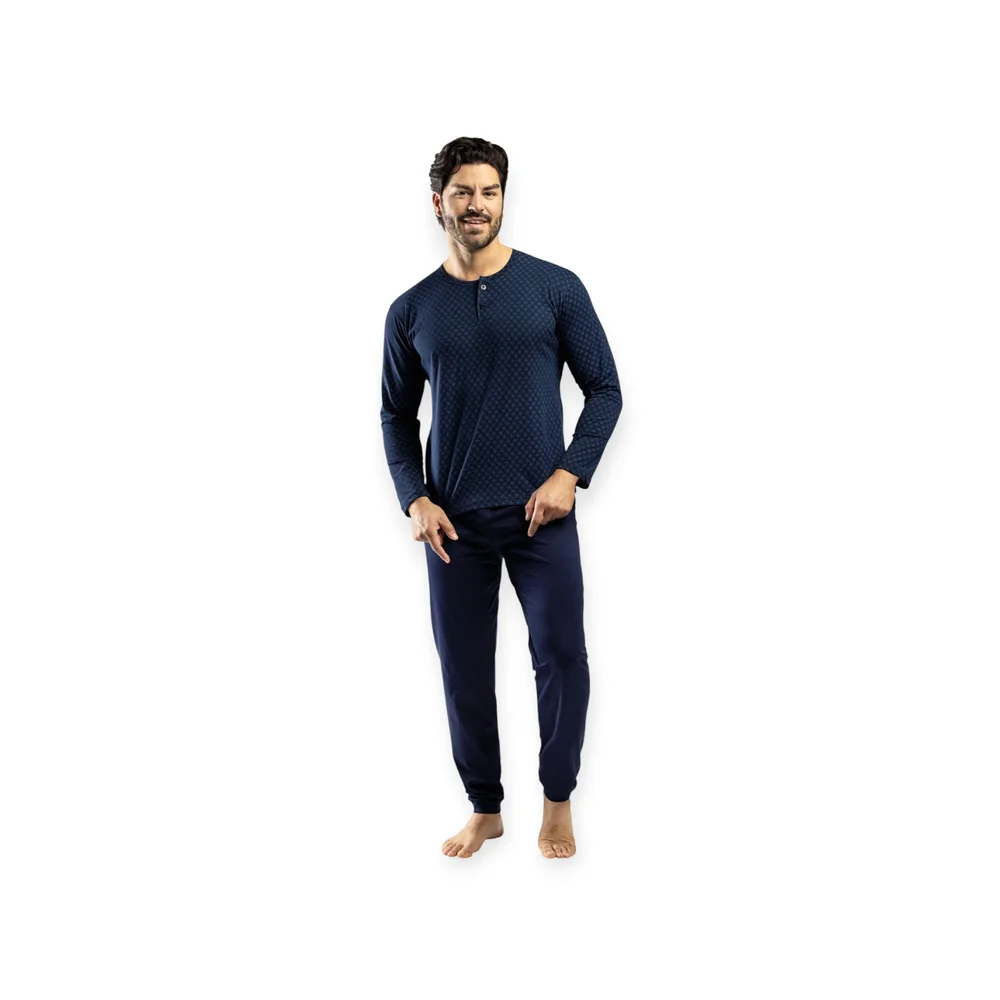 Pijama de hombre de entretiempo 100% algodón. Camiseta con un discreto estampado, con cuello redondo con dos botones y puños rectos. Pantalón con elástico en la cintura y puños.