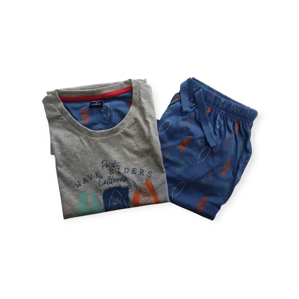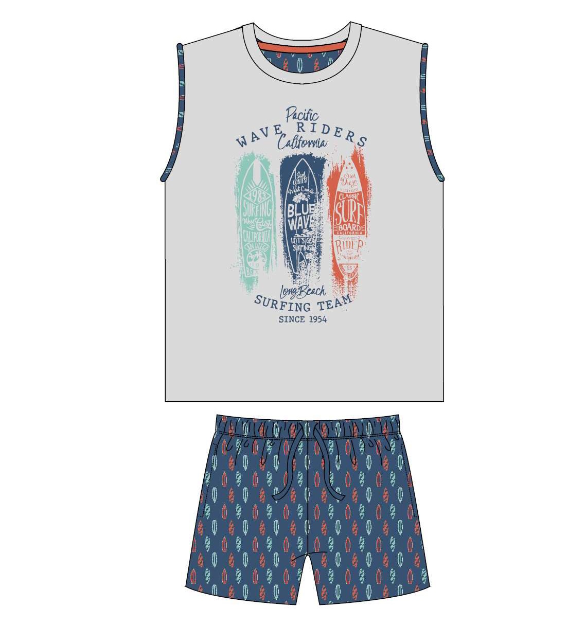 Pijama de hombre de verano, 100% algodón. Camiseta sin mangas, con cuello redondo a la caja. Pantalón corto liso con elástico en la cintura y lazo. También lleva bolsillos.