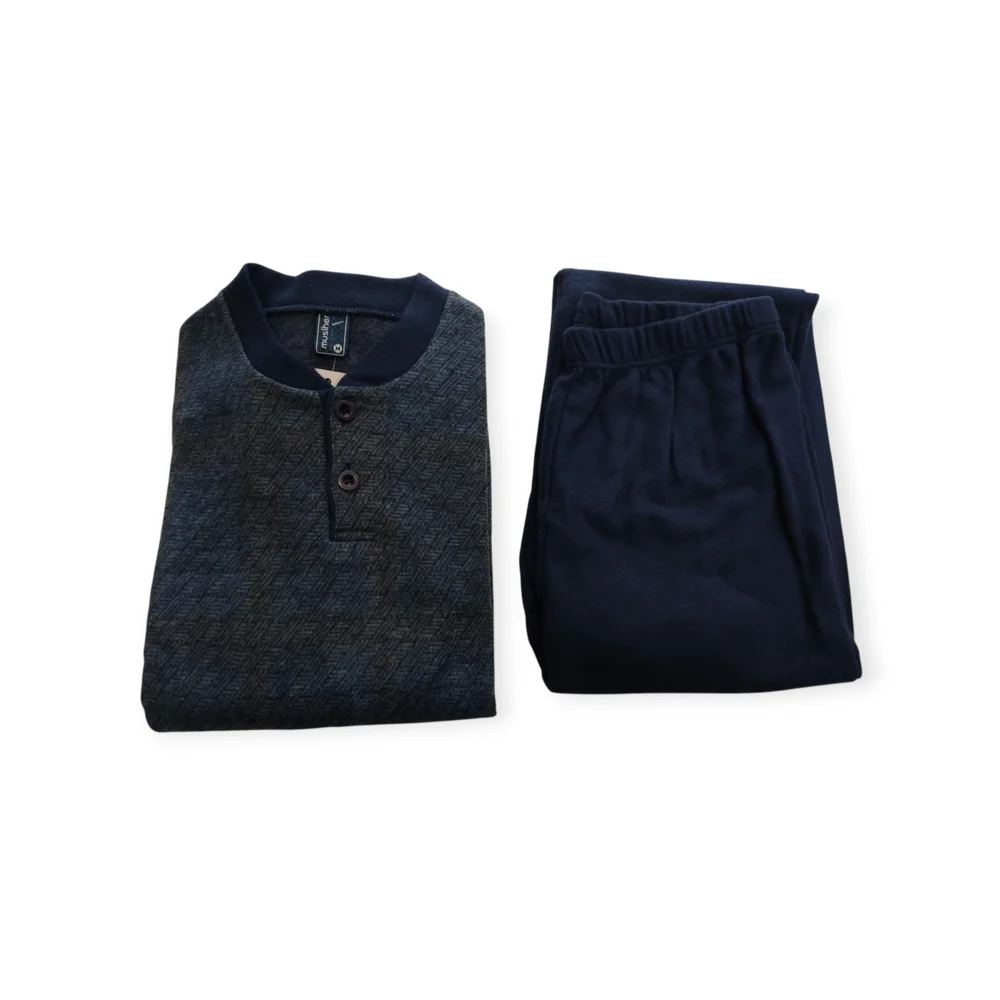 Pijama de hombre con tejido Punto Milano. Tejido muy suave y cálido. Camiseta con dos botones en el cuello y puños en las mangas.