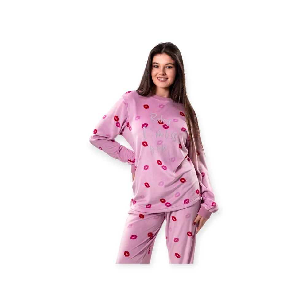 Pijama para mujer de Spandex. Tejido con tacto de terciopelo en el exterior y afelpado interior. Muy suave, cálido y elástico. Puños en mangas y patas. Pantalón con elástico y lazo en la cintura.