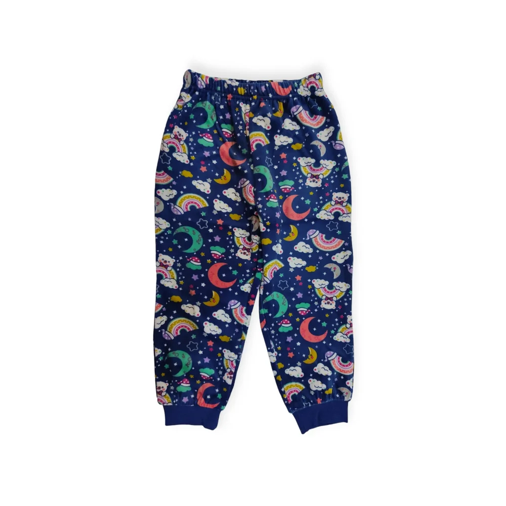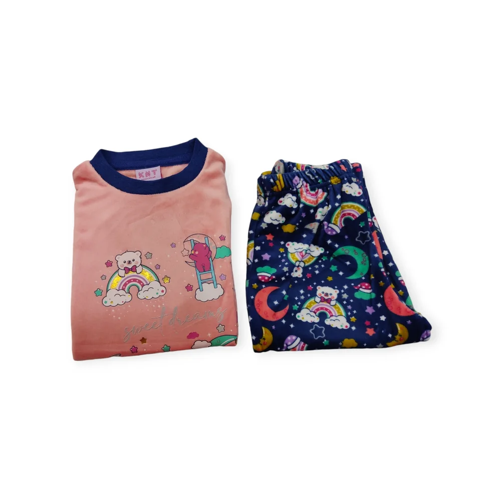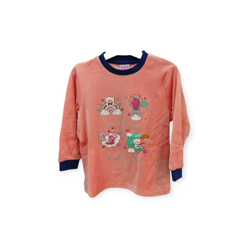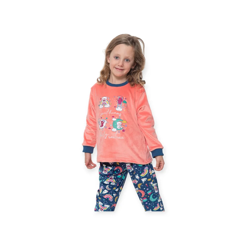 Pijama para niña de Spandex. Tejido con tacto de terciopelo en el exterior y afelpado interior. Muy suave, cálido y elástico. Puños en mangas y patas. Pantalón con elástico en la cintura. Dibujos estampados.
