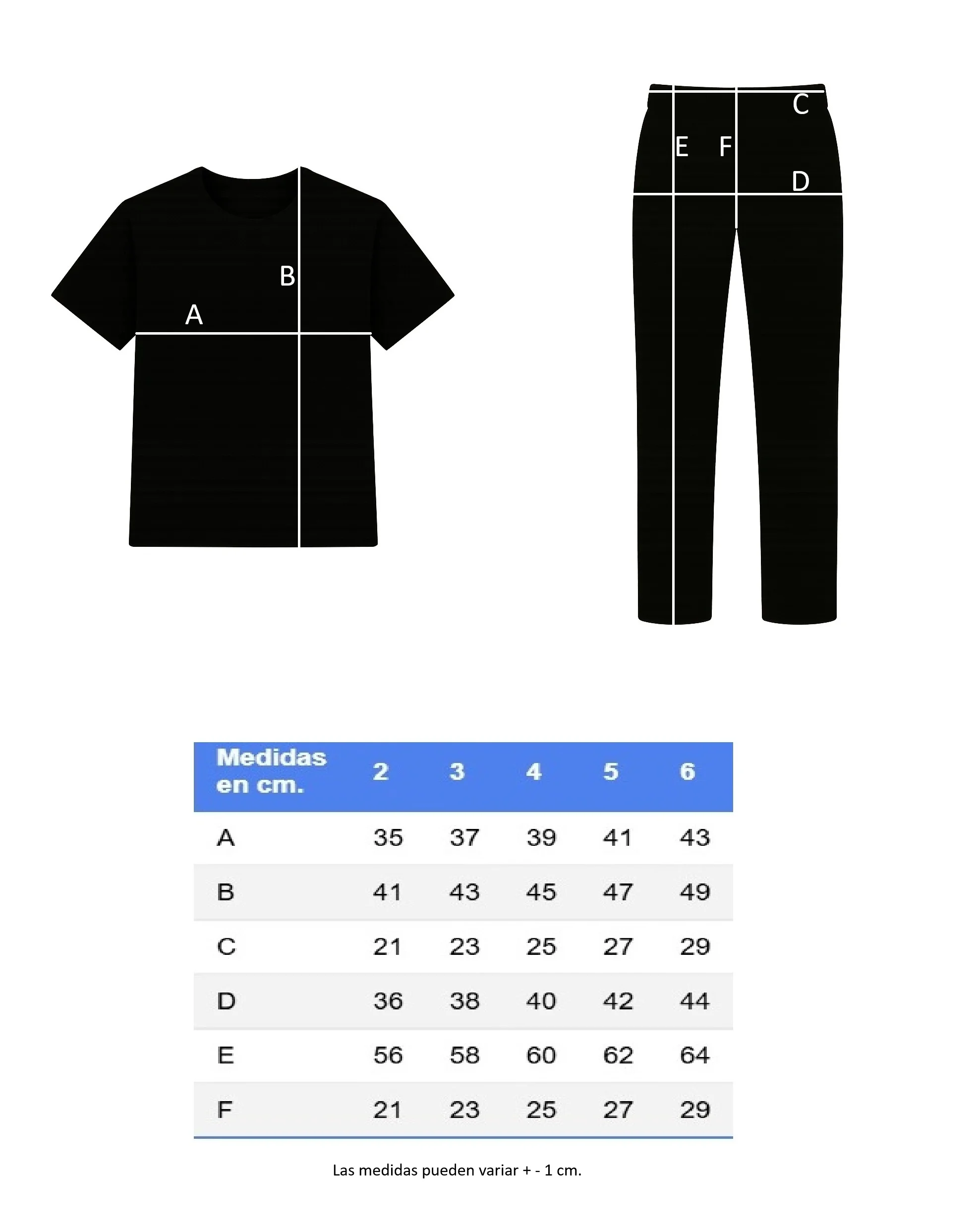 Camiseta con cuello redondo con puños en las mangas. Pantalón con elástico en la cintura y puños.