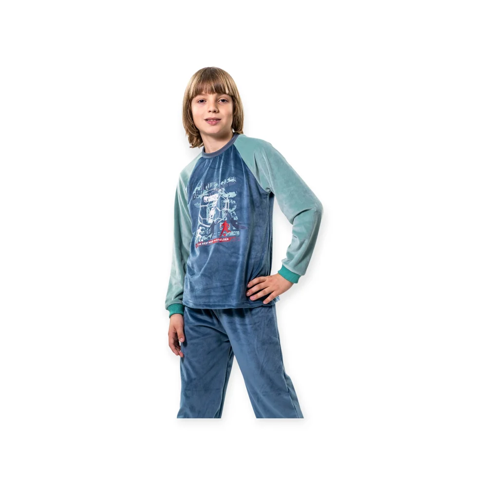 Pijama para niño de Spandex. Tejido con tacto de terciopelo en el exterior y afelpado interior. Muy suave, cálido y elástico. Puños en mangas y patas. Pantalón con elástico en la cintura.