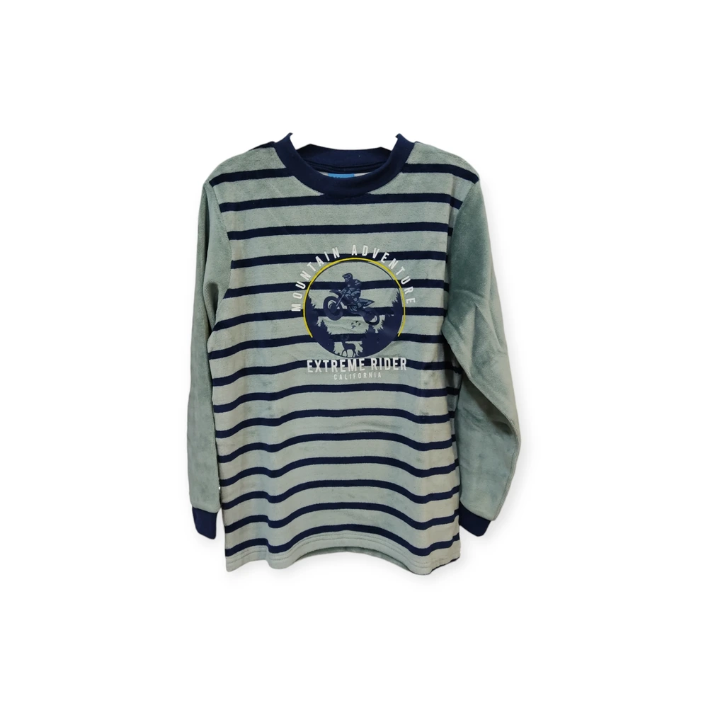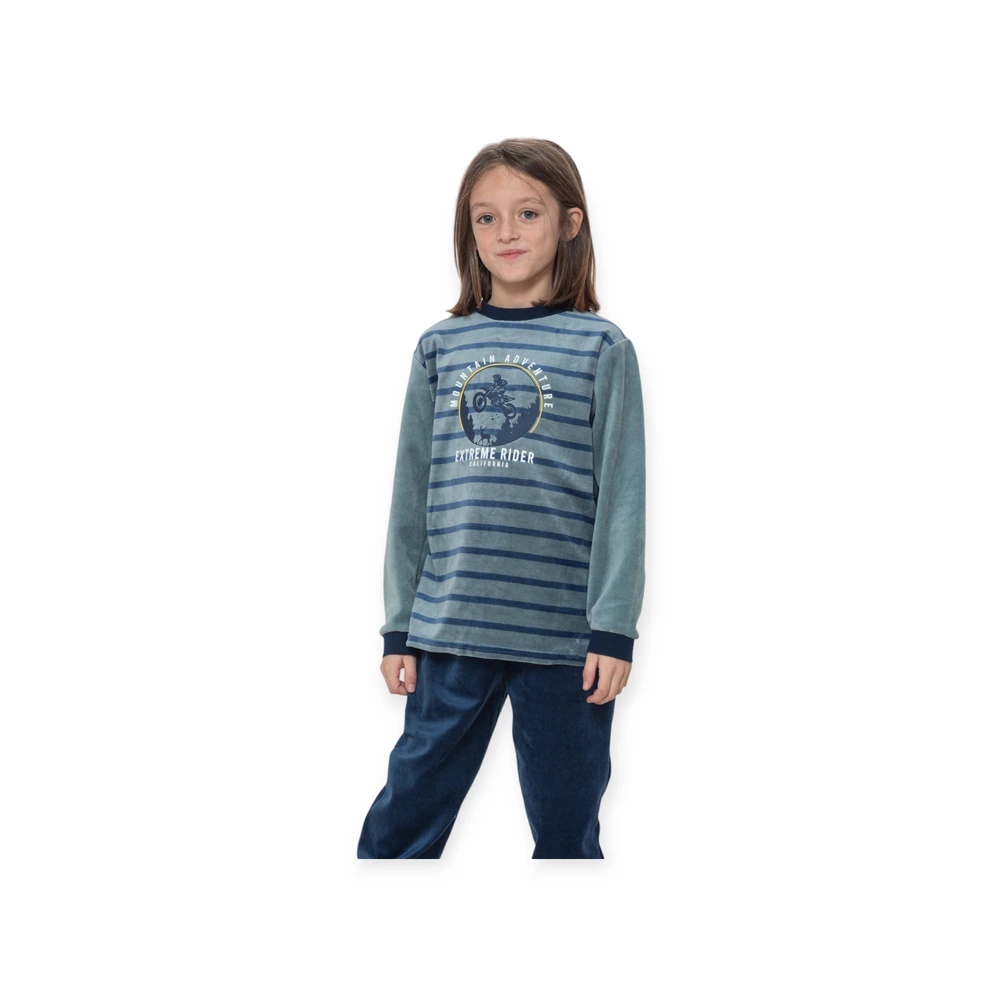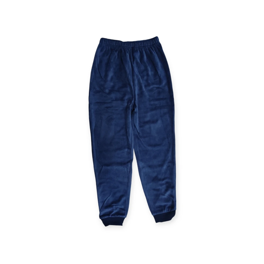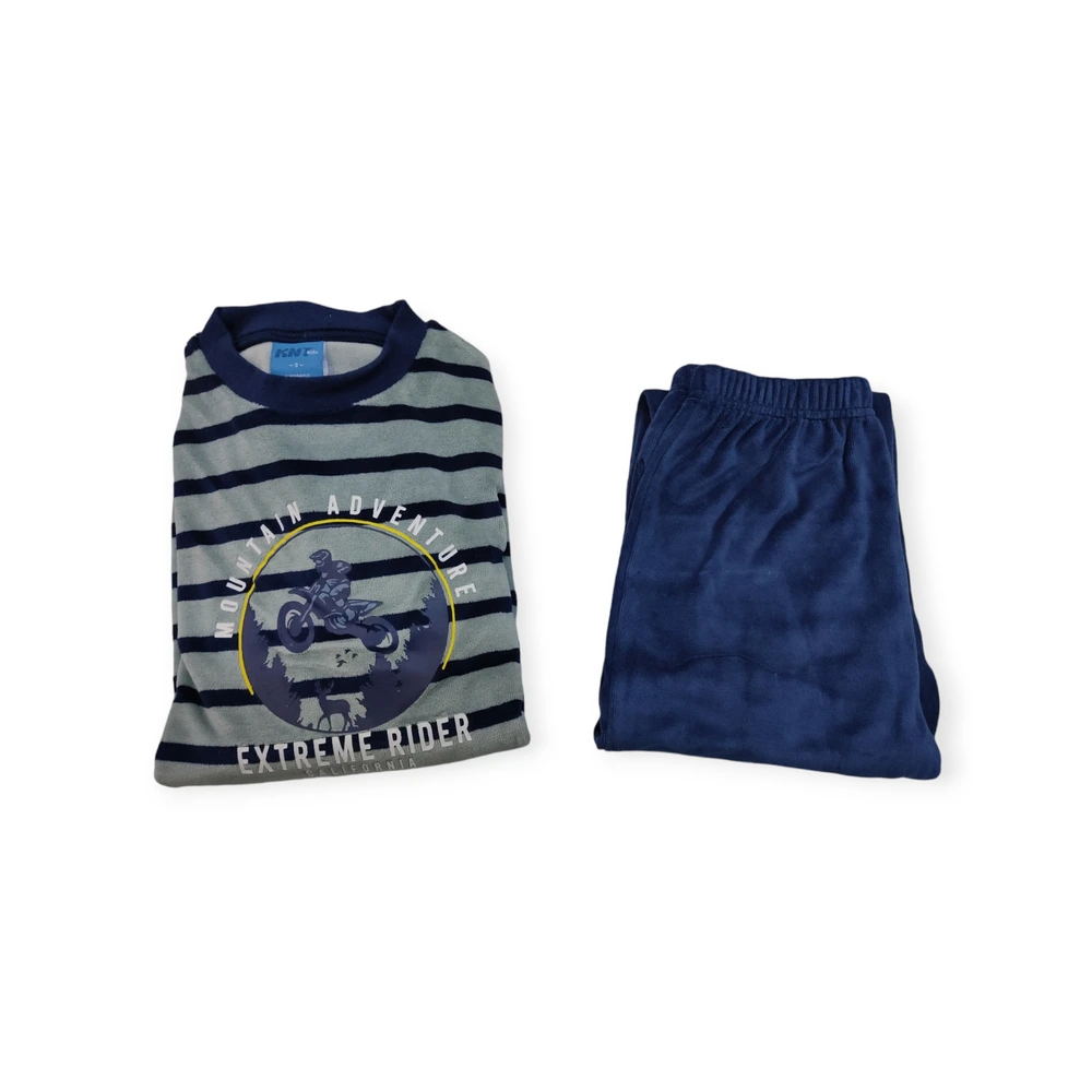 Pijama para niño de terciopelo. Tejido afelpado en el exterior y sin afelpado interior. Muy suave y cálido. Camiseta con estampado en el pecho y puños en las mangas. Pantalón con elástico en la cintura y puños.