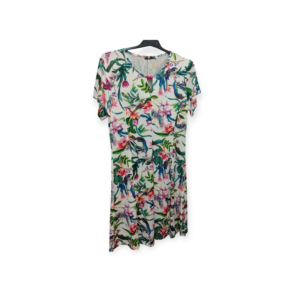 Vestido de manga corta con estampado de flores multicolor sobre fondo blanco. Tiene cuello redondo con un pequeño corte en la parte central y un detalle de bolitas de madera sobre el mismo. El vestido lleva pinzas en la parte delantera para que se ajuste mejor al contorno del cuerpo.